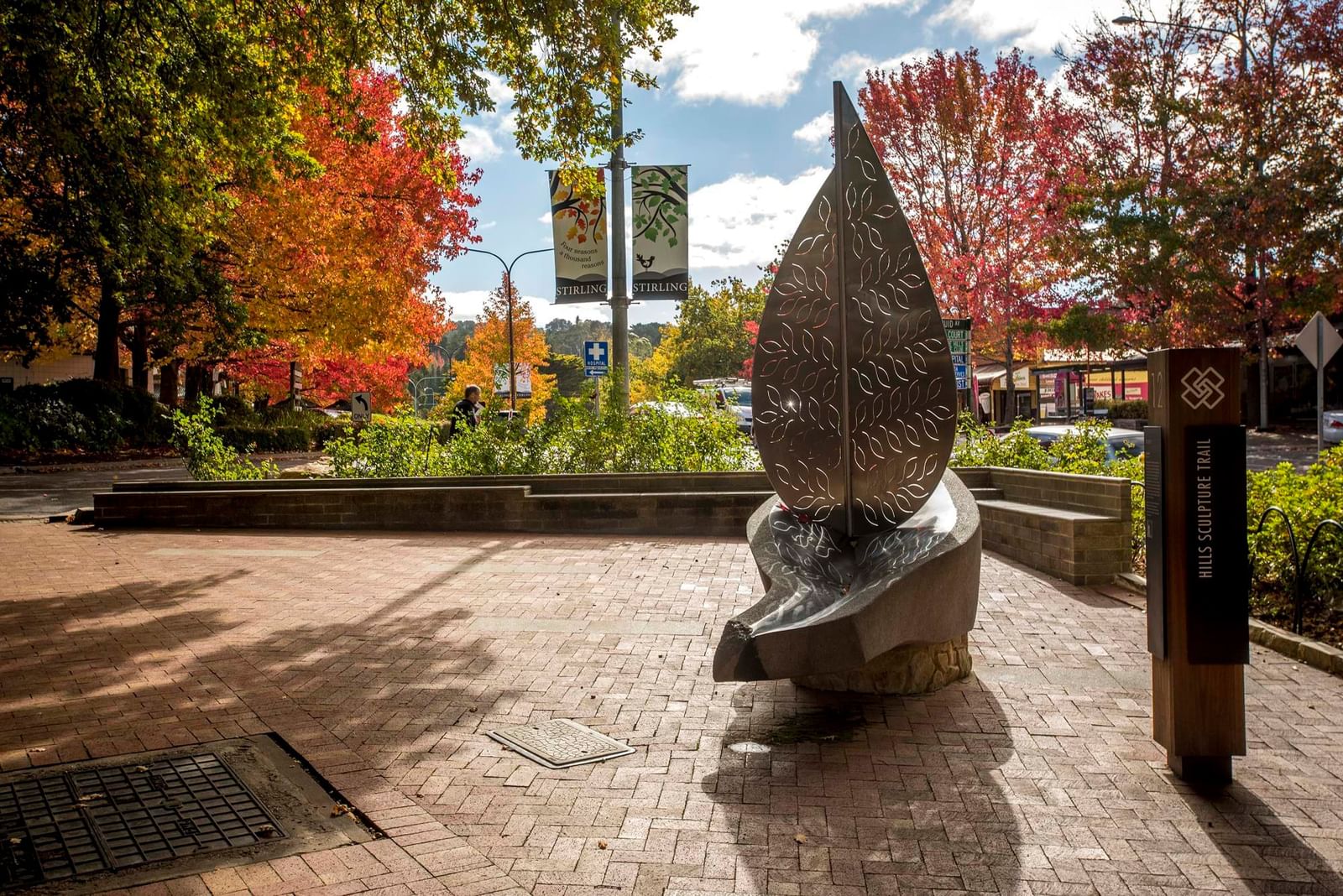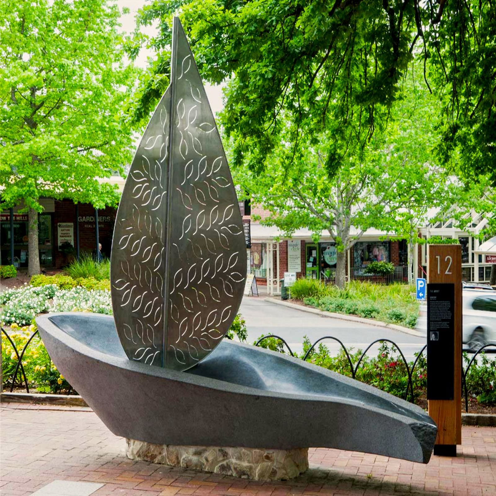 At the top of Druid Avenue in Stirling is a sculpture by New Zealand artist Jocelyn Pratt that was carved from Black Hill granite in 2014. This whimsical leaf boat, topped with a stainless steel sail, is titled Journeys.